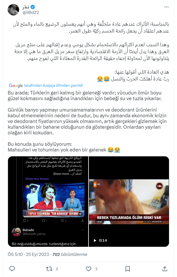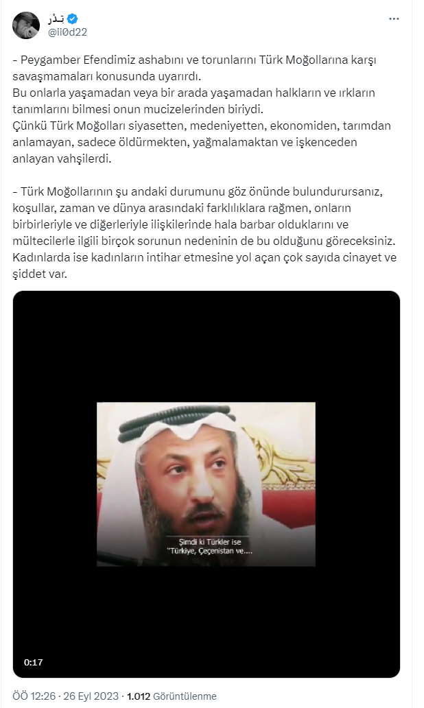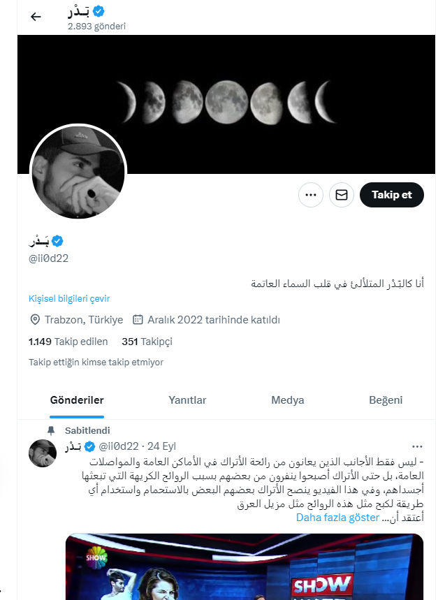 X platformunda @ii0d22 kullanıcı isimli Badr adlı kişi Türk milletine ve Türk vatandaşlarına yönelik hakaret ve ırkçı ithamlar içeren paylaşımlara imza atıyor.