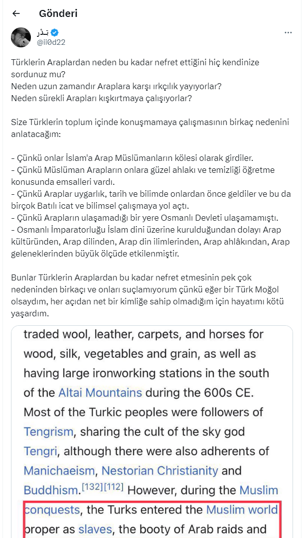 Kendi zekası doğrultusunda Türklerin Araplardan neden nefret ettiğini açıklamaya çalışan şahıs, bunun nedenini Türklerin İslam’a Arap Müslümanların kölesi olarak girmesini gösteriyor.