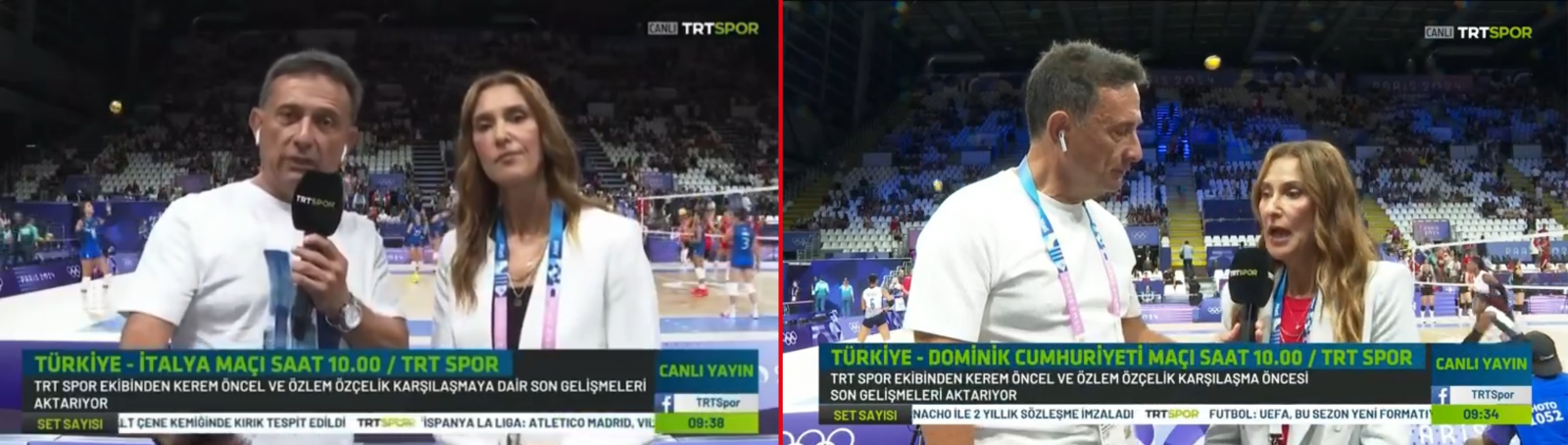 Maçın spikeri Kerem Öncel maça kısa bir süre kala Paris’teki salondan voleybol kadın milli takımının eski kaptanı Özlem Özçelik ile birlikte canlı yayına bağlandı.