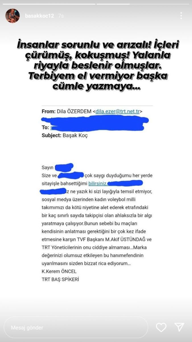 Kerem Öncel’in TRT yönetimine Başak Koç’u şikayet eden bir mail gönderdiği iddia ediliyordu ki; Koç, kişisel sosyal medya hesabında ilgili mailin içeriğini paylaştı: