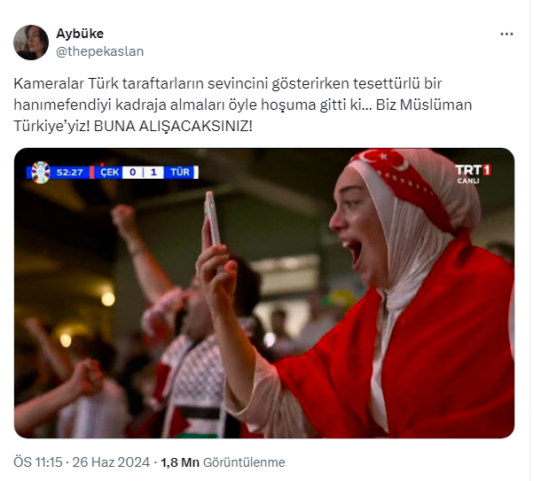“Kameralar Türk taraftarların sevincini gösterirken tesettürlü bir hanımefendiyi kadraja almaları öyle  hoşuma gitti ki… Biz Müslüman Türkiye’yiz! BUNA ALIŞACAKSINIZ!”