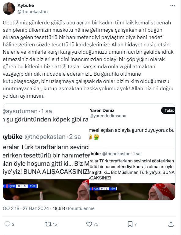 “Geçtiğimiz günlerde göğüs ucu açılan bir kadını tüm laik Kemalist cenah sahiplenip ülkemizin maskotu haline getirmeye çalışırken sırf bugün ekrana gelen tesettürlü bir hanımefendiyi paylaştım diye beni hedef haline getiren sözde tesettürlü kardeşlerimize Allah hidayet nasip etsin. Nelerle ve kimlerle karşı karşıya olduğumuzu umarım acı bir şekilde idrak etmezseniz de bizleri sırf dini inancımızdan dolayı bir çöp yığını olarak gören bu kitlenin bize attığı taşlar karşısında onlara gül atmaktan vazgeçip dimdik mücadele edersiniz!… Bu güruhla ölümüne kutuplaşacağız, biz uzlaşmaya çalışsak da onlar bizim kim olduğumuzu unutmayacaklar, kutuplaşmaktan başka yolumuz yok! Allah bizleri doğru yoldan ayırmasın.”
