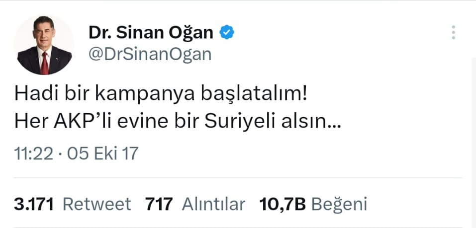 Ülkücü Oğan madem Suriyelileri bu kadar seviyorsunuz o zaman evinizde bakın diyor; AKP’li Oğan ise içten içe Suriyelileri çok seviyor olacak ki evine Suriyeli almak için AKP’ye geçiyor…