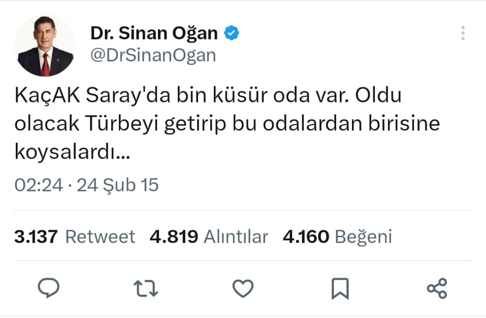 Diğerinde ise, “KaçAK Saray’da bin küsür oda var. Oldu olacak Türbeyi getirip bu odalardan birisine koysalardı...” ifadelerini kullanıyor.