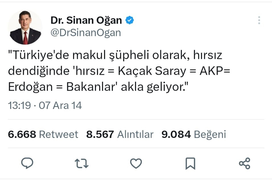 Başka bir paylaşımda ise, “Türkiye’de makul şüpheli olarak, hırsız dendiğinde ‘hırsız = Kaçak Saray = AKP = Erdoğan = Bakanlar’ akla geliyor.” demekte.