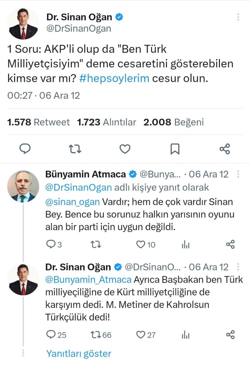 Şaka bir yana, bir AKP’linin kesinlikle milliyetçi olamayacağını söyleyen Ülkücü Oğan yorumlarda da şunu diyor; “Ayrıca Başbakan ben Türk milliyetçiliğine de Kürt milliyetçiliğine de karşıyım dedi. M. Metiner de Kahrolsun Türkçülük dedi!”
