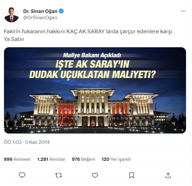 Ülkücü Oğan bir paylaşımında, “Fakirin fukaranın hakkını KAÇ AK SARAY larda çarçur edenlere karşı Ya Sabır” çekiyor.