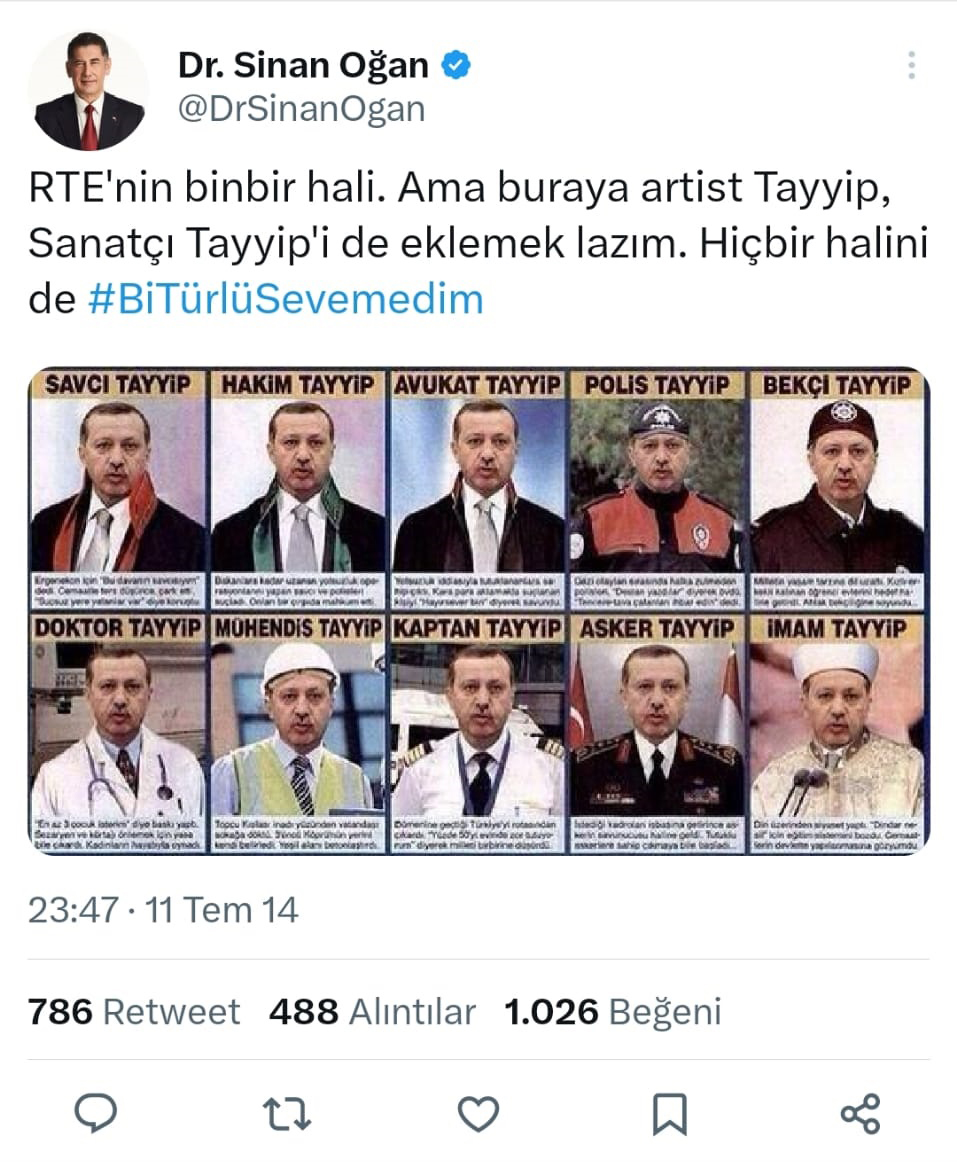 Ülkücü Sinan Oğan’ın bir de Cumhurbaşkanı Erdoğan’a karşı kişisel bir karşıtlığı var. Erdoğan’ı hiç sevemediğini, paylaştığı görsel “RTE’nin binbir hali. Ama buraya artist Tayyip, Sanatçı Tayyip’i de eklemek lazım. Hiçbir halini de bi türlü sevemedim” sözlerini ekleyerek ifade ediyor.