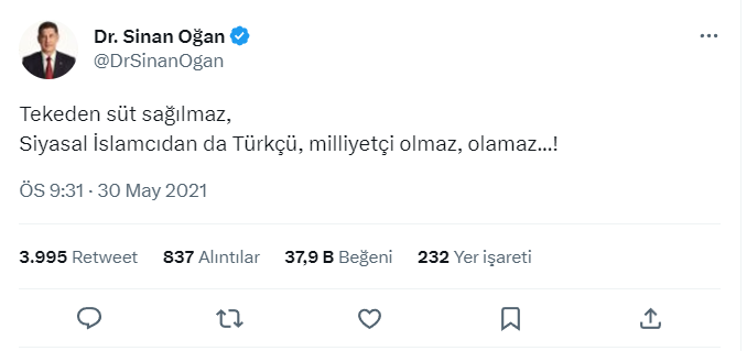 Başka bir tweetinde, “Tekeden süt sağılmaz, Siyasal İslamcıdan da Türkçü, milliyetçi olmaz, olamaz…!” yazıyor.