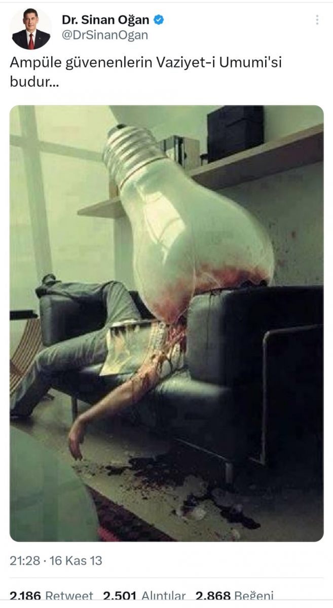 Oğan 16 Kasım 2013’te, “Ampule güvenenlerin Vaziyet-i Umimi’si budur” diyerek kafasına ampul geçirilmiş ve kanlar içinde kalmış bir insan fotoğrafı paylaşıyor. Fakat burada önemli olan paylaşım değil altında yazdıkları.