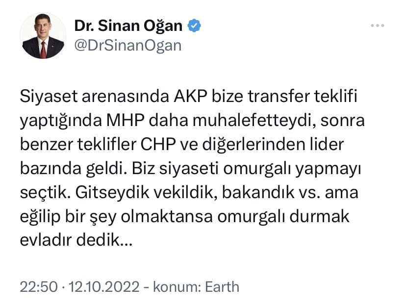 Ülkücü Oğan duruşunu şöyle belirtiyordu; “Siyaset arenasında AKP bize transfer teklifi yaptığında MHP daha muhalefetteydi, sonra benzer teklifler CHP ve diğerlerinden lider bazında geldi. Biz siyaseti omurgalı yapmayı seçtik. Gitseydik vekildik, bakandık vs. ama eğilip bir şey olmaktansa omurgalı durmak evladır dedik...”