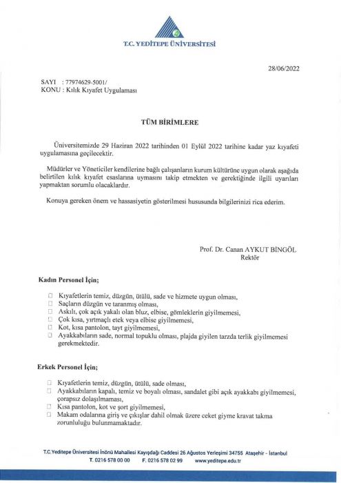 Resmi yazıda da; “Üniversitemizde 29 Haziran 2022 tarihinden 01 Eylül 2022 tarihine kadar yaz kıyafeti uygulamasına geçilecektir. Müdürler ve yöneticiler kendilerine bağlı çalışanlarının kurum kültürüne uygun olarak aşağıda belirtilen kılık kıyafet esaslarına uymasını takip etmekten gerektiğinde ilgili uyarıları yapmaktan sorumlu olacaklardır” ifadelerine yer verildi.