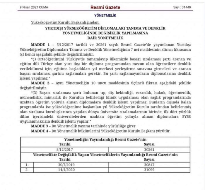 Yurtdışı Yükseköğretim Diplomaları Tanıma ve Denklik Yönetmeliği'nin "Mezuniyet tanıma belgesi ve diploma denklik belgesi başvurularının incelenmesi sonucu yapılacak işlemler" başlıklı 7. maddesinin altıncı fıkrasının (ç) bendinde: "Türkiye’nin taraf olduğu uluslararası anlaşmalarla öğrenim dilinin Türkçe olarak belirlendiği programlar ile Yükseköğretim Kurulu tarafından yurtdışında tanınan Türkçe programlar dışında öğrenim dili Türkçe olan programlardan alınan diplomalar için yapılan denklik başvuruları reddedilir." hükmüne yer veriliyor.