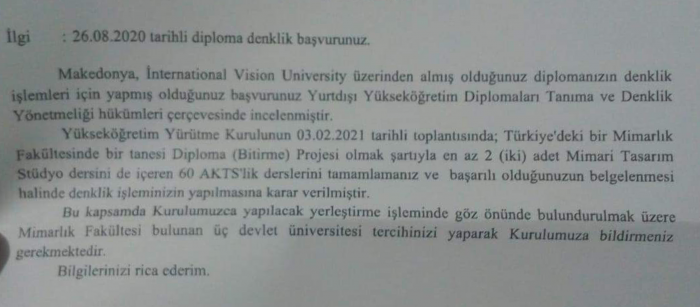 Bir öğrenci Makedonya Uluslararası Vizyon Üniversitesi’nde mimarlık eğitimi aldı ve Türkiye’de diploma denkliğine başvuruda bulundu. Yapılan başvuru Yurtdışı Yükseköğretim Diplomaları Tanıma ve Denklik Yönetmeliği hükümleri çerçevesinde incelendi.