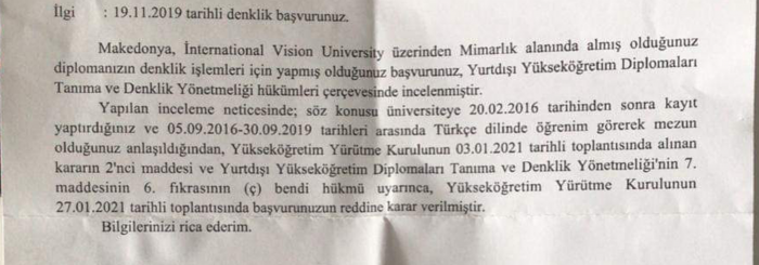 Fakat sonradan bir tebligat daha gönderildi. Bu belgeye göre ise öğrenci bahsedilen üniversiteye 20.02.2016 tarihinden sonra kayıt yaptırdığı için; Yurtdışı Yükseköğretim Diplomaları Tanıma ve Denklik Yönetmeliği’nin 7. maddesinin 6. Fıkrasının (ç) bendi hükmü uyarınca başvurusu reddedildi.