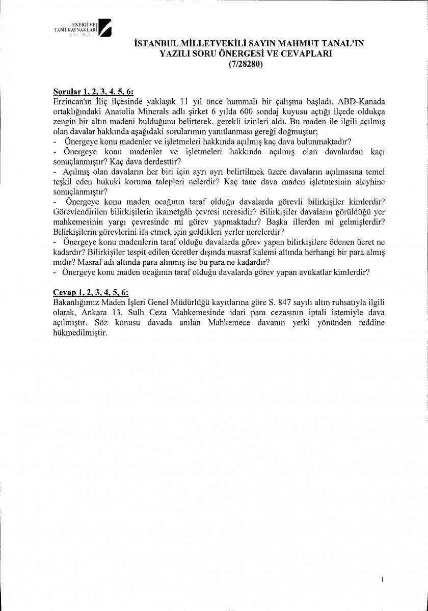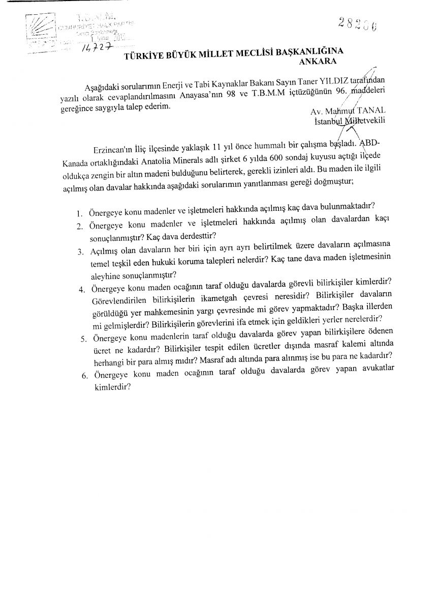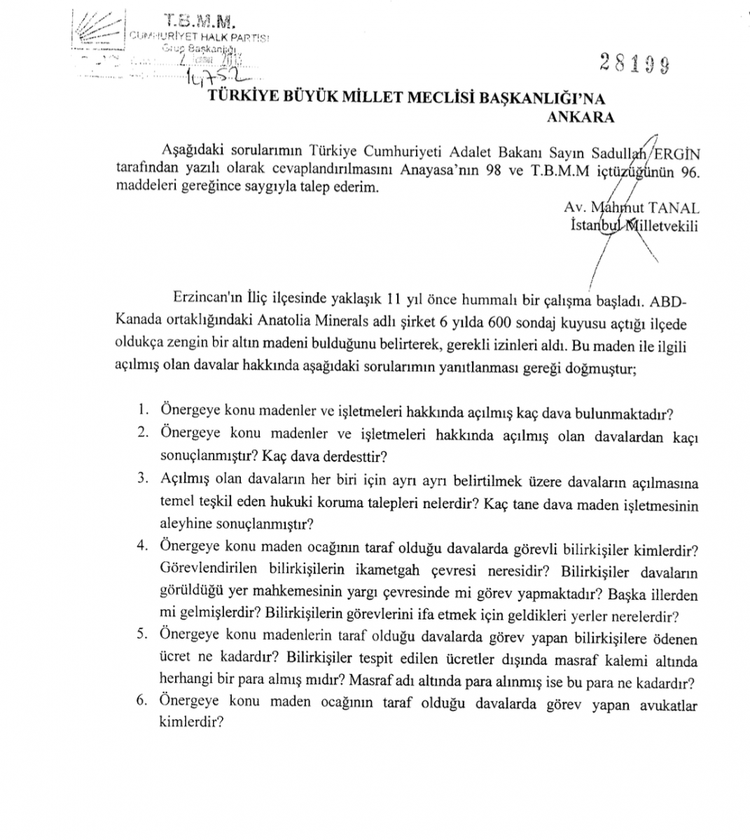 O dönemde İstanbul Milletvekili CHP’li Mahmut Tanal, (28. Dönem Şanlıurfa vekili) 2013 yılında dönemin Adalet Bakanı Sadullah Ergin ve dönemin Enerji Bakanı Taner Yıldız’ın yanıt verdiği 6 maddelik soru önergesinde, Anatolia Minerals şirketinin ‘6 yılda 600 ton sondaj kuyusu açtığına’ dikkat çekerek, önergeye konu olan madenler ve işletmeler hakkında ilgili açılmış davalar olup olmadığını, maden ocağının taraf olduğu davalarda görev alan bilirkişilerin kimler olduğu, ikamet adresleri ile ödenen ücretlere kadar can alıcı soruları Meclis’e taşıyor. Dönemin Adalet Bakanı, DEVA Partisi Ankara Milletvekili Sadullah Ergin, dönemin Enerji ve Tabii Kaynaklar Bakanı Taner Yıldız önergeleri yanıtlıyor. İşte önerge ve bakanların yanıtları.