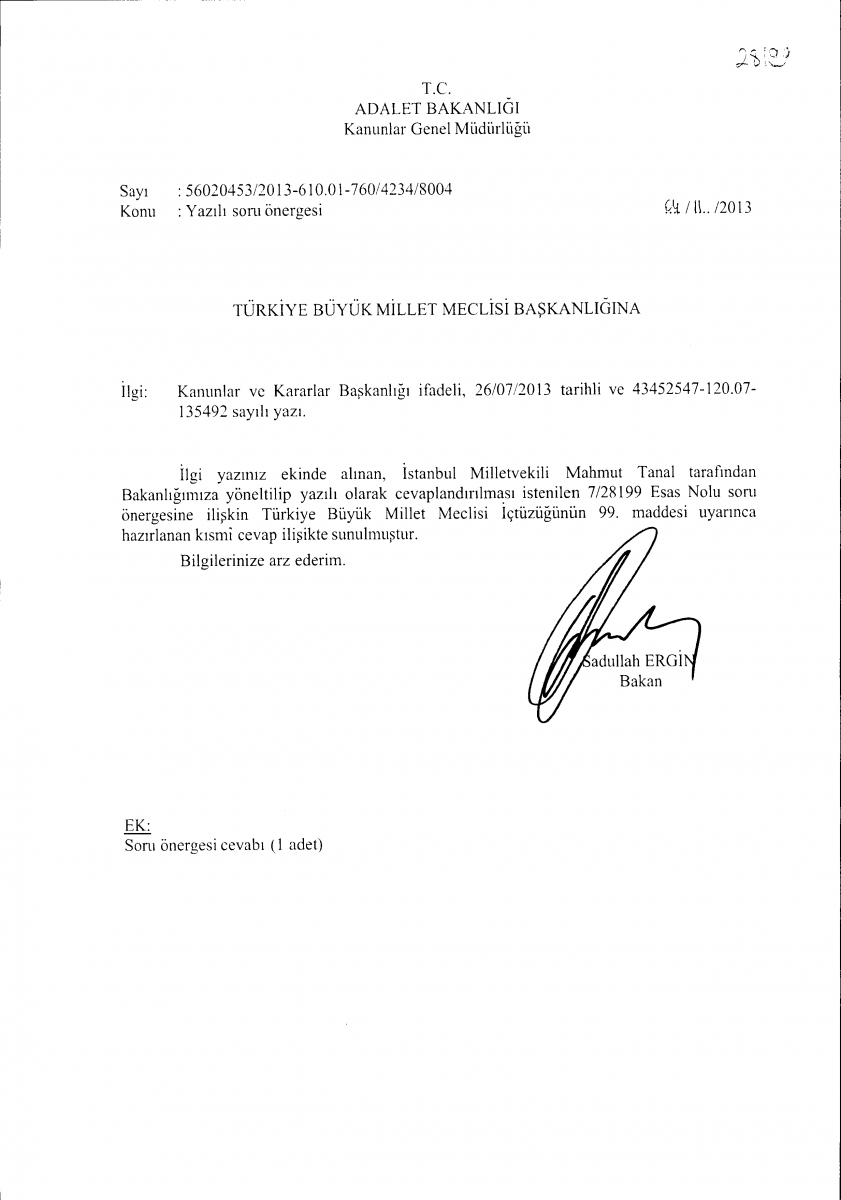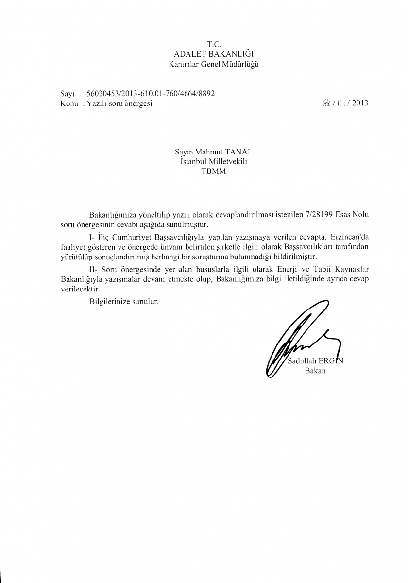 Dönemin Adalet Bakanı, DEVA Partisi Ankara Milletvekili Sadullah Ergin, CHP’li Tanal’ın önergesine, İliç Cumhuriyet Başsavcılığıyla yapılan yazışmaya verilen cevabı belirterek, Erzincan’da faaliyet gösteren şirketle ilgili Başsavcılıkları tarafından yürütülüp sonuçlandırılmış herhangi bir soruşturma bulunmadığı yanıtı veriliyor. Dönemin Enerji ve Tabii Kaynaklar Bakanı Taner Yıldız da, Tanal’ın soru önergesine, altın ruhsatıyla ilgili idari para cezasının iptali istemiyle açılan davaya dikkat çekiyor ve “Söz konusu davada anılan mahkemece davanın yetki yönünden reddine hükmedildiği’ yanıtı veriyor.
