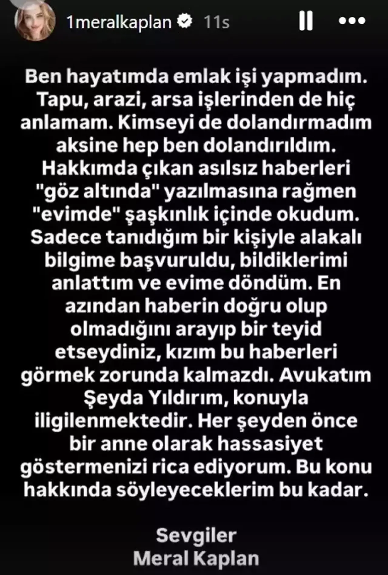 Konuya ilişkin sosyal medya hesabından açıklama yapan Meral Kaplan, “Ben hayatımda emlak işi yapmadım. Tapu, arazi, arsa işlerinden de hiç anlamam. Kimseyi de dolandırmadım aksine hep ben dolandırıldım. Hakkımda çıkan asılsız haberleri evimde şaşkınlık içinde okudum. Sadece tanıdığım bir kişiyle alakalı bilgime başvuruldu, bildiklerimi anlattım ve evime döndüm.” ifadelerini kullandı. Kaplan, hukuki sürecin avukatı tarafından takip edildiğini belirtti ve özellikle anne olarak hassasiyet gösterilmesini istedi.