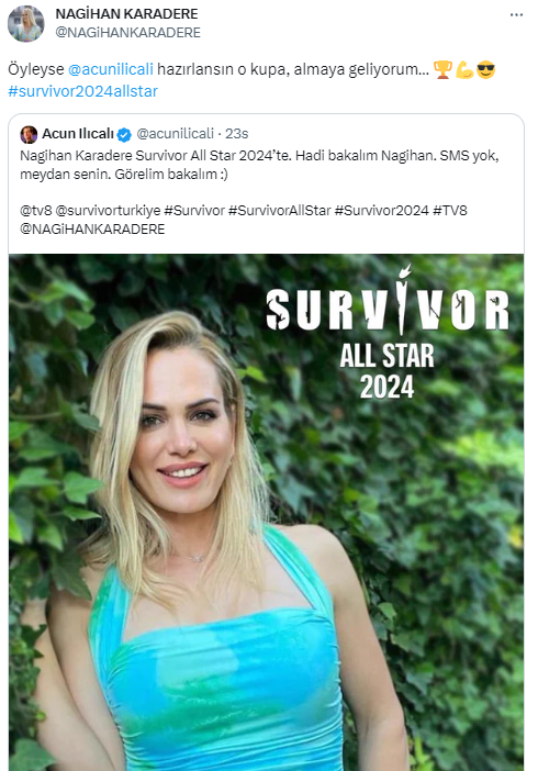 Oyuncu Nihat Altınkaya'nın ardından Survivor All Star 2024'ün 2. yarışmacısı Nagihan Karadere oldu. Haberi duyuran Acun Ilıcalı'nın "SMS yok, meydan senin" sözlerine Karadere'den cevap gecikmedi.