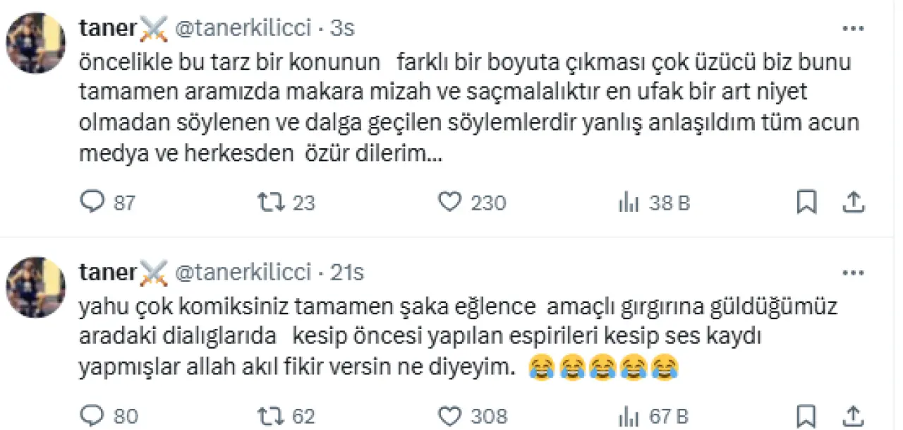 Bu tarz bir konunun bu kadar farklı bir boyuta taşınması gerçekten üzücü. Biz bunu aramızda makara, mizah ve saçmalık olarak söyledik. En ufak bir art niyet yoktu. Yanlış anlaşıldım. Tüm Acun Medya’dan ve herkesten özür dilerim.”
