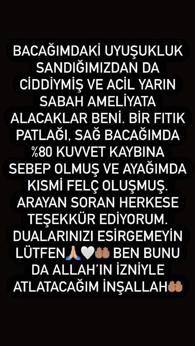 “Bacağımdaki uyuşukluk sandığımızdan da ciddiymiş ve yarın sabah ameliyata alacaklar beni. Bir fıtık patlağı. Sağ bacağımda yüzde 80 kuvvet kaybına sebep olmuş ve ayağımda kısmi felç oluşmuş. Arayan soran herkese teşekkür ediyorum. Dualarınızı esirgemeyin lütfen. Ben bunu da Allah’ın izniyle atlatacağım inşallah.”