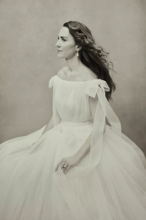Middleton'ın, yine Alexander McQueen için Sarah Burton'ın tasarladığı beyaz elbise giydiği poz da çok konuşuldu. Siyah- beyaz bu fotoğrafta Kate Middleton'ın parmağındaki evlilik yüzüğü ile uçuşan saçlarının arasından görünen küpeleri dikkat çekti. Bu takıların her ikisi de Prens William'ın annesi Prenses Diana tarafından kullanılmıştı.