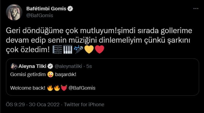 Bafetimbi Gomis ise Aleyna Tilki'ye, "Geri döndüğüme çok mutluyum! Şimdi sırada gollerime devam edip senin müziğini dinlemeliyim çünkü şarkını çok özledim!" ifadeleri ile yanıt verdi.