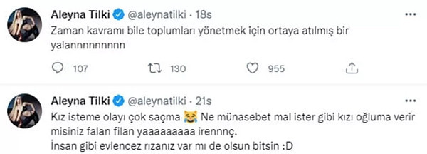Genç şarkıcı, Twitter hesabından, "Kız isteme olayı çok saçma. Ne münasebet mal ister gibi, 'Kızı oğluma verir misiniz?' falan filan ya, iğrenç! İnsan gibi, 'Evleneceğiz, rızanız var mı?' de, olsun bitsin" ifadelerini kullandı.