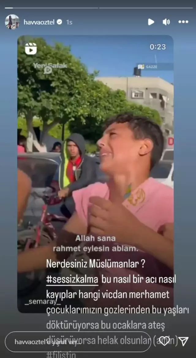 İsrail'in Gazze'de yüzlerce sivilin ölümüne neden olan hastane saldırısının yankıları sürerken, sosyal medyada da ünlü isimler İsrail'e tepkilerini dile getiriyor. Bu isimlerden biri de Aleyna Tilki'nin annesi Havva Öztel oldu.