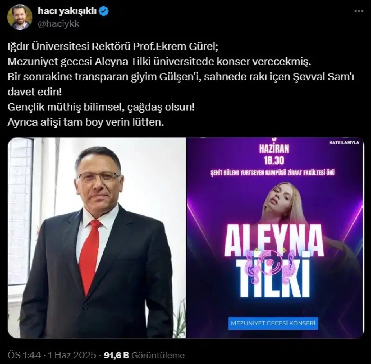 Iğdır Üniversitesi, 3 Haziran'da düzenlemeyi planladığı '2024-2025 Akademik Yılı Mezuniyet Programı' kapsamında yapılacak Aleyna Tilki konserini iptal etti.
