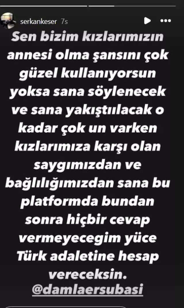 Damla Ersubaşı paylaşımda "Torbacı Serkan Keser ne oldu canım kızlarım derken iyiydi he benim babamın kalbi dururken şimdi ne oldu? P.zevenk kardeşin beni arayıp iyi ki öldü derken iyiydi di mi? Torbacı Serkan Keser he?" sözleri ağızları açıkta bıraktı.