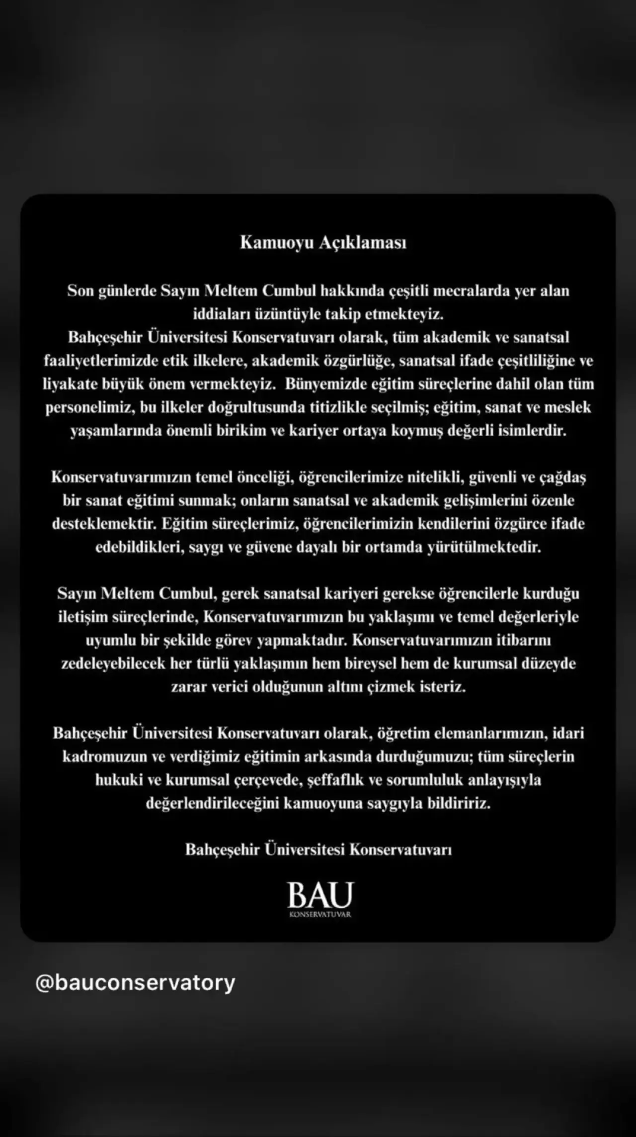 Bahçeşehir Üniversitesi Konservatuvarı, öğretim elemanlarının, idari kadronun ve verilen eğitimin arkasında durulduğunu, tüm süreçlerin hukuki ve kurumsal çerçevede şeffaflık ve sorumluluk anlayışıyla değerlendirileceğini kamuoyuna saygıyla duyurdu.