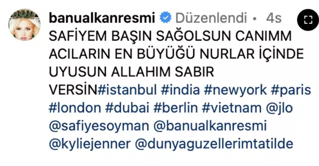 Banu Alkan, önce evladını kaybeden arkadaşı Safiye Soyman'a başsağlığı dilemeyip kendini paylaşmaya devam ettiği için tepki çekti, ardından bir başsağlığı mesajı yayınladı yayınlamasına ama 'keşke yayınlamasaydı' dedirtti.