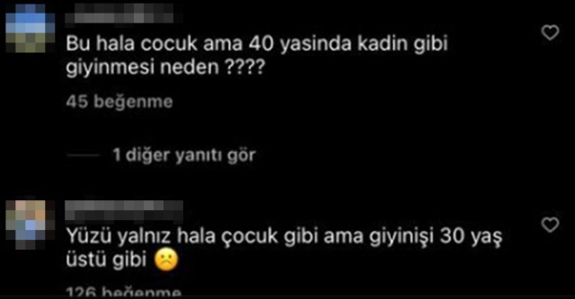 "Büyüse de bu kıyafet 14 yaş için olmamış. Çok tatlı, sevimli bir kızdı. Büyüdükçe yine yaşına göre giyinmeli""14 mü? Yazık...""Sanki üniversite mezunu gibi giyinmiş.""Bu hala çocuk ama 40 yaşında kadın gibi giyinmesi neden?" “Yüzü yalnız hala çocuk gibi ama giyinişi 30 yaş üstü gibi.”