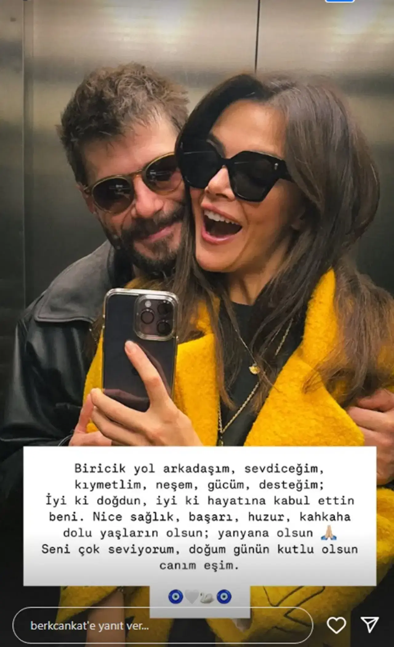 "Biricik yol arkadaşım, sevdiceğim, kıymetlim, neşem, gücüm, desteğim. İyi ki doğdun. İyi ki hayatına kabul ettin beni. Nice sağlık, başarı, huzur, kahkaha dolu yaşların olsun. Yan yana olsun. Seni çok seviyorum, doğum günün kutlu olsun canım eşim."