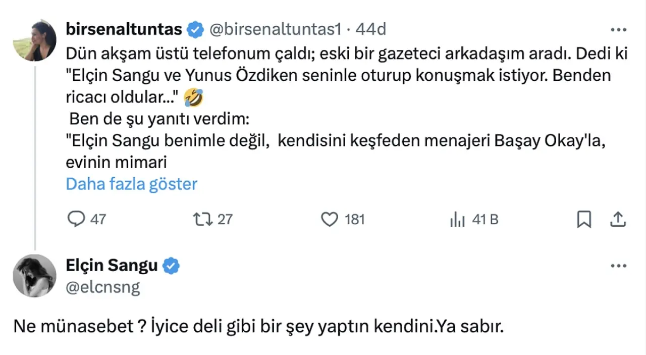 Ünlü oyuncu Elçin Sangu ile gazeteci Birsen Altuntaş arasındaki tansiyon yeniden yükseldi. Bir süredir devam eden atışmalar, son günlerde karşılıklı suçlamalar ve dava restleşmeleriyle yeniden gündemde. Tartışmaların odağında sektör içi tekelleşme iddiaları, haberlerin doğruluğu ve kişisel suçlamalar yer alıyor.