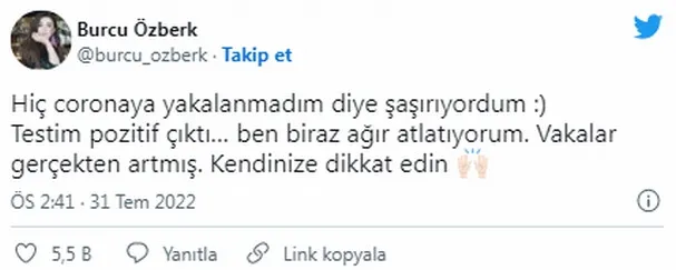 "'Hiç koronaya yakalanmadım' diye şaşırıyordum, testim pozitif çıktı. Ben biraz ağır atlatıyorum. Vakalar gerçekten artmış, kendinize dikkat edin."