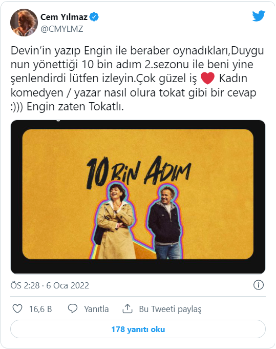 Twitter hesabından 10 Bin Adım dizisinin ikinci sezonu için övgü dolu bir paylaşım yapan Yılmaz, "Devin’in yazıp Engin ile beraber oynadıkları,Duygu nun yönettiği 10 bin adım 2.sezonu ile beni yine şenlendirdi lütfen izleyin.Çok güzel iş Kadın komedyen / yazar nasıl olura tokat gibi bir cevap :))) Engin zaten Tokatlı." ifadelerini kullandı.
