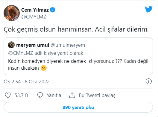 Cem Yılmaz'ın takipçisine yanıtı ise "Çok geçmiş olsun hanıminsan. Acil şifalar dilerim." oldu.