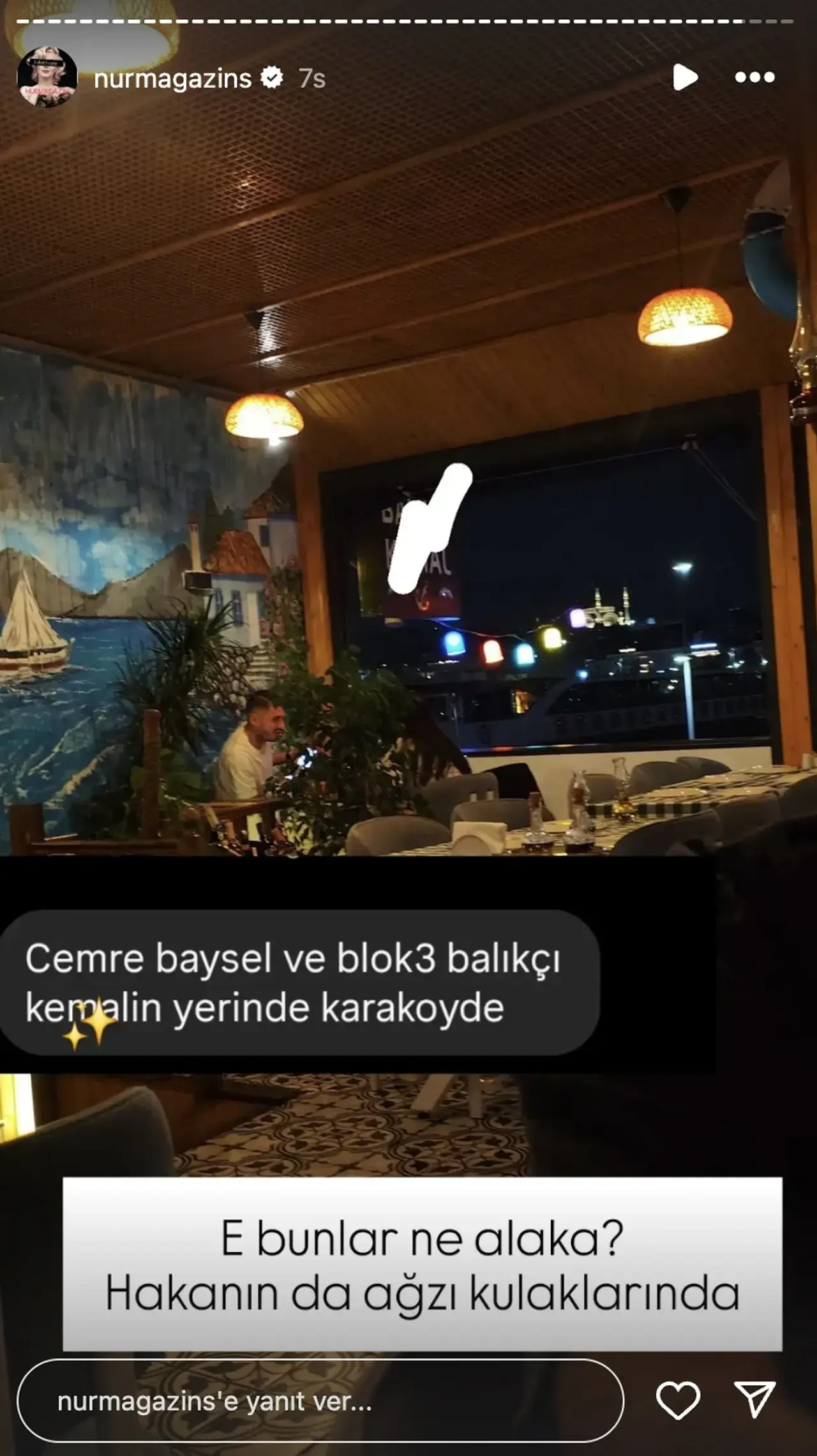 Nurmagazins’e ulaşan bir takipçinin iddiasına göre, Baysel ile rap dünyasının yükselen isimlerinden Blok3 (Hakan Aydın) dün akşam İstanbul’da bir mekânda birlikte yemek yerken görüntülendi. Masadaki kişinin Cemre Baysel olup olmadığı sosyal medyada tartışma konusu oldu; kimileri görüntüdeki kişinin oyuncu olduğunu savunurken, bazı kullanıcılar benzetme olabileceğini öne sürdü.