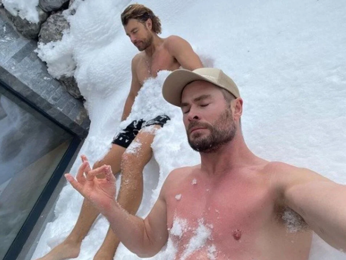 Fotoğrafta, Hemsworth ve arkadaşı, karların üzerinde gözlerini kapatmış, meditasyon yapar gibi görünüyor.