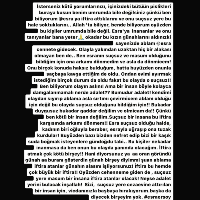 "İsterseniz kötü yorumlarınızı, içinizdeki bütün pislikleri buraya kusun benim umrumda bile değilsiniz çünkü ben biliyorum Esra'ya iftira attıklarını ve onu suçsuz yere bu hale soktuklarını.. Allah da biliyor, ben de biliyorum o yüzden bu kişiler umrumda bile değil. Esra'ya inananlar ve onu tanıyanlar bana yeter.