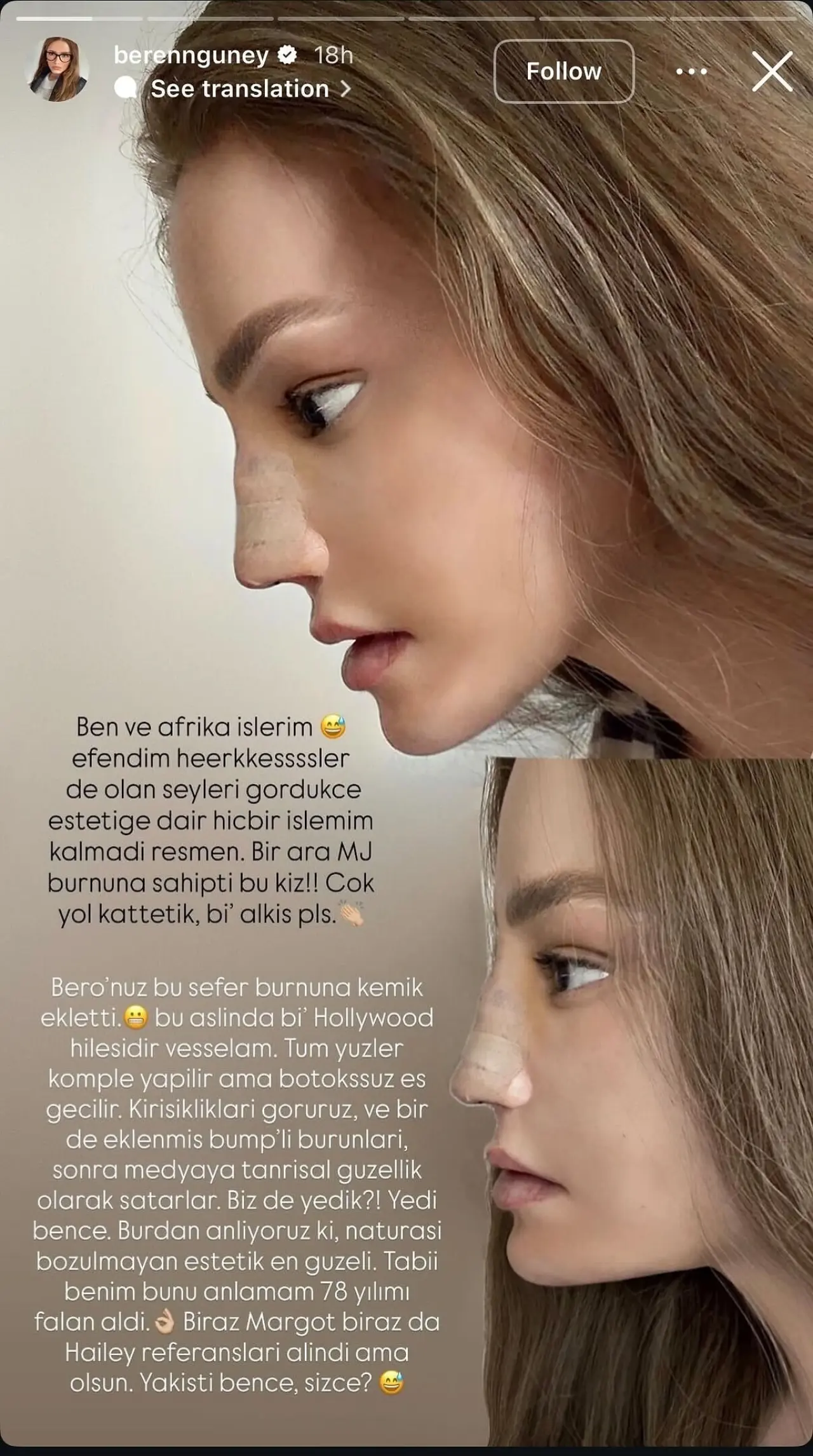 Sosyal medyada büyük bir takipçi kitlesine sahip olan Beren Güney, daha önce cinsiyet geçiş süreciyle gündeme gelmişti. Bu kez ise estetik açıklamaları ile dikkatleri üzerine çekti. Güney, Instagram hikâyelerinde burun estetiği yaptırdığını duyurarak hem süreci hem de değişimin nedenlerini kendi ağzından paylaştı.