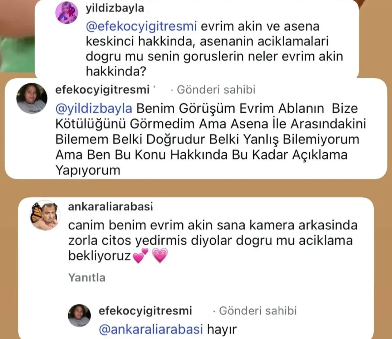 Efe Koçyiğit soruları içtenlikle yanıtladı ve kendisinin set süresince herhangi bir problem yaşamadığını söyledi. Asena Keskinci ile yaşananlar hakkında ise bir fikri olmadığını ekledi.