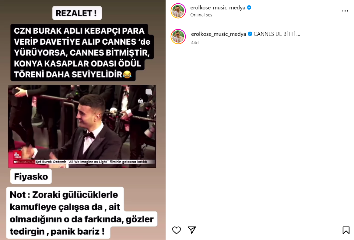 Burak Özdemir'in Cannes Film Festivali'ne katılmasını değerlendiren Erol Köse ise ‘Rezalet’ ifadelerini kullandı.