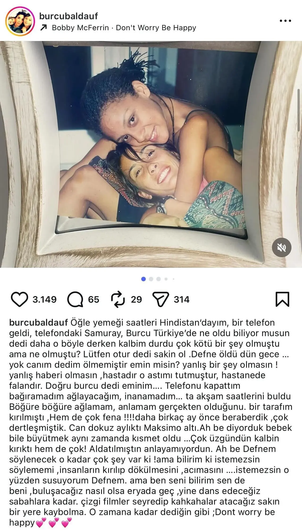 “Öğle yemeği saatleri Hindistan'dayım, bir telefon geldi. Telefonda Samuray, ‘Burcu Türkiye'de ne oldu biliyor musun?’ dedi. Daha o böyle derken kalbim durdu. Çok kötü bir şey olmuştu ama ne olmuştu? ‘Lütfen otur’ dedi, ‘sakin ol… Defne öldü dün gece…’