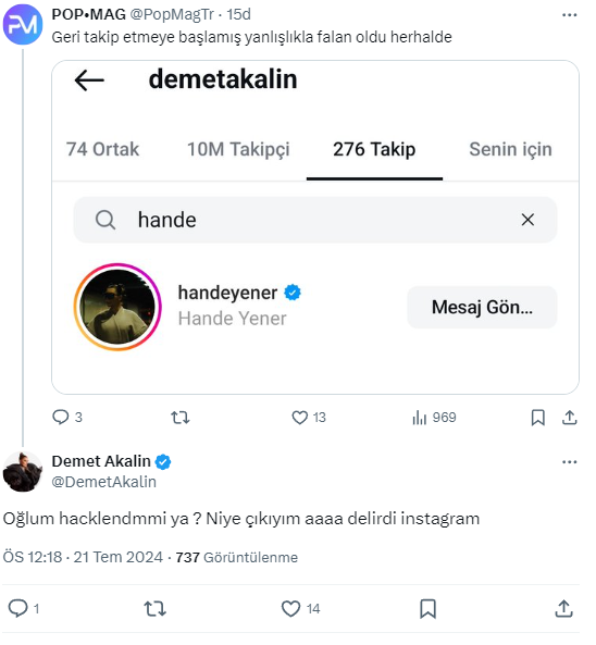 X'te bir magazin sayfasının haberine göre, Demet Akalın, Hande Yeneri takipten çıkmasının ardından tekrar takip etmeye başladı.