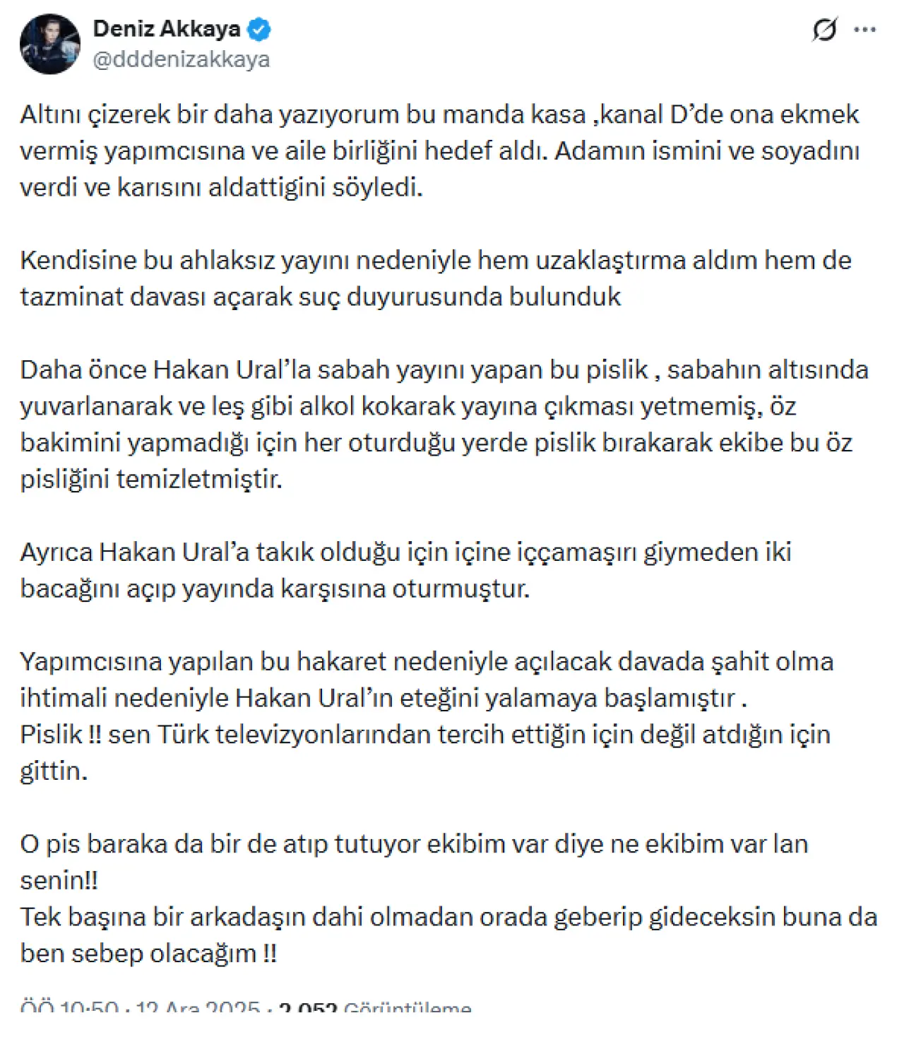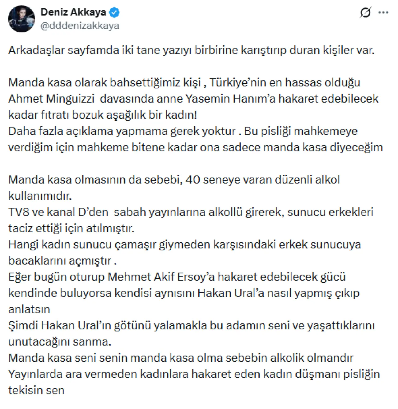 Akkaya, hedef aldığı kişinin bir yapımcıyı ve ailesini alenen hedef alarak hakaret ettiğini, bu nedenle hukuki sürecin başladığını söyledi.