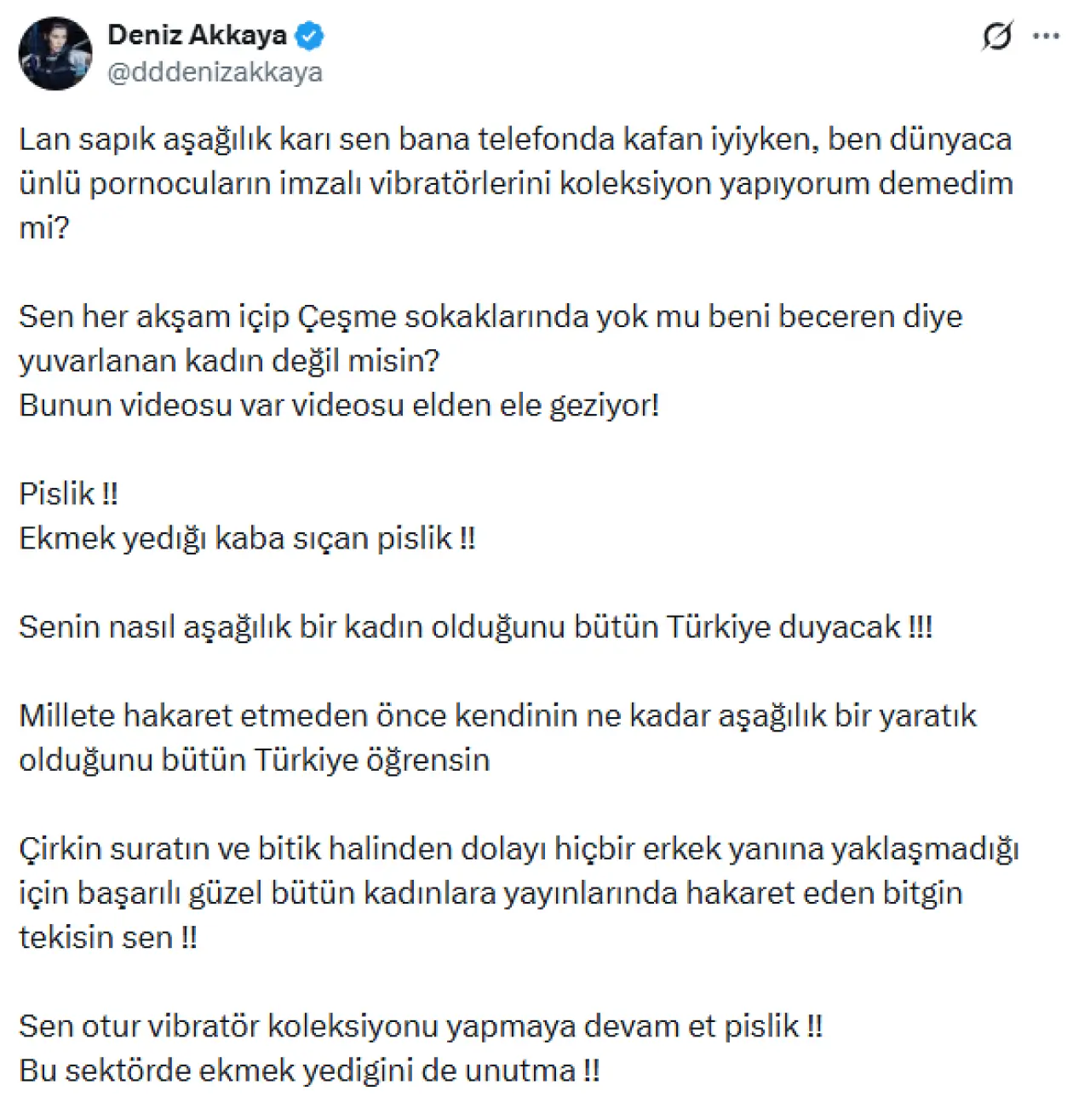 Akkaya’nın paylaşımlarının bir bölümünde ise oldukça kişisel iddialar yer aldı. İddiasına göre söz konusu kişi, bir telefon konuşmasında kendisine “Dünyaca ünlü pornocuların imzalı vibratörlerini koleksiyon yapıyorum” dedi.