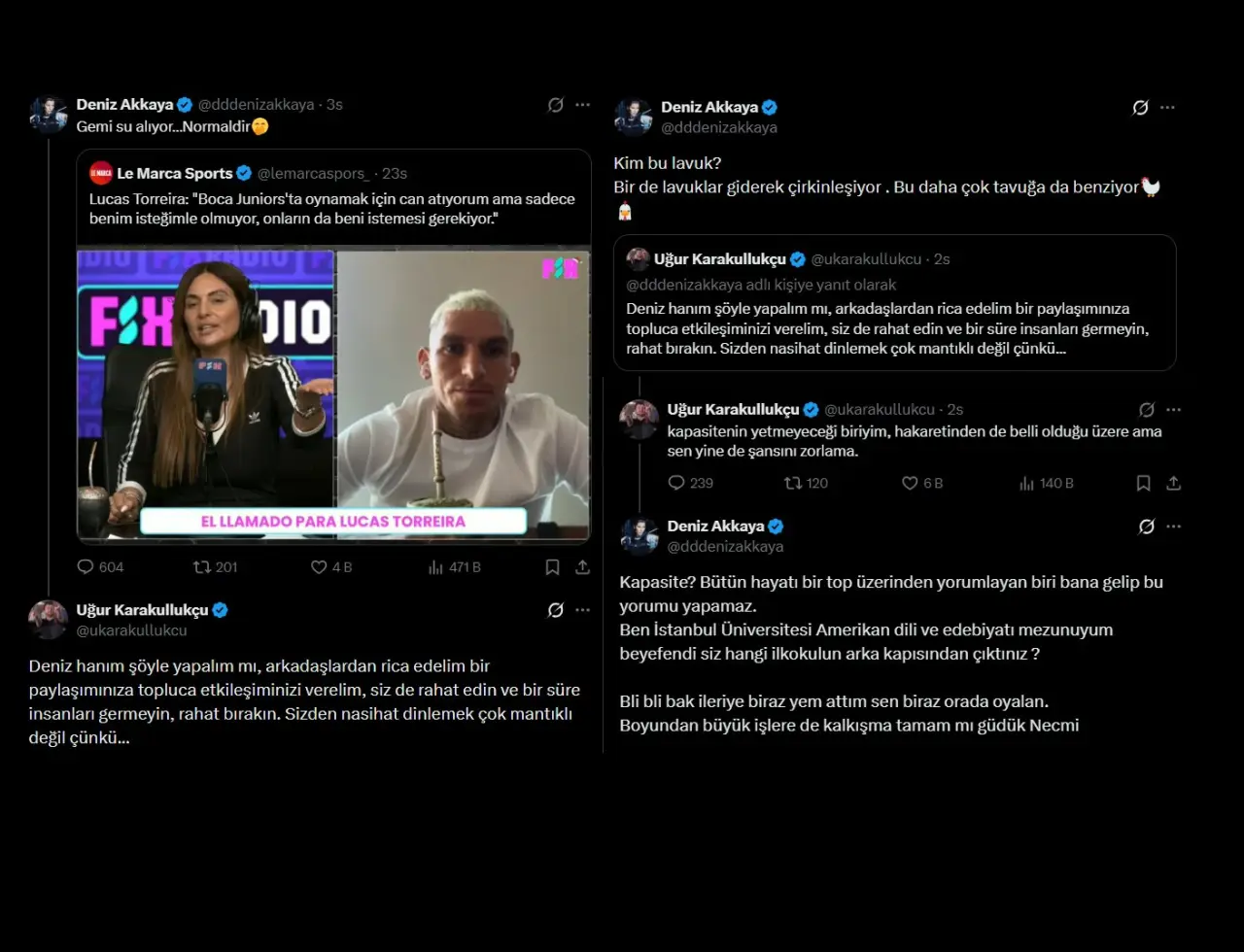 Tartışma, Deniz Akkaya’nın Lucas Torreira’nın Boca Juniors isteğiyle ilgili habere, Galatasaray’ı ima ederek "Gemi su alıyor... Normaldir" yorumunu yapmasıyla başladı. Bu yoruma cevap veren spor yorumcusu Uğur Karakullukçu, "Deniz Hanım şöyle yapalım mı, arkadaşlardan rica edelim bir paylaşımınıza topluca etkileşiminizi verelim, siz de rahat edin ve bir süre insanları germeyin. Sizden nasihat dinlemek çok mantıklı değil çünkü..." ifadelerini kullandı.